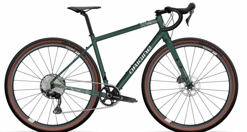 Origine avec sa gamme Trail prpopose un gravel en aluminium dynamique. Sa position relevée s’adapte aux chemins, à la route, comme au voyage ou à la ville. C’est un gravel accessible et polyvalent.