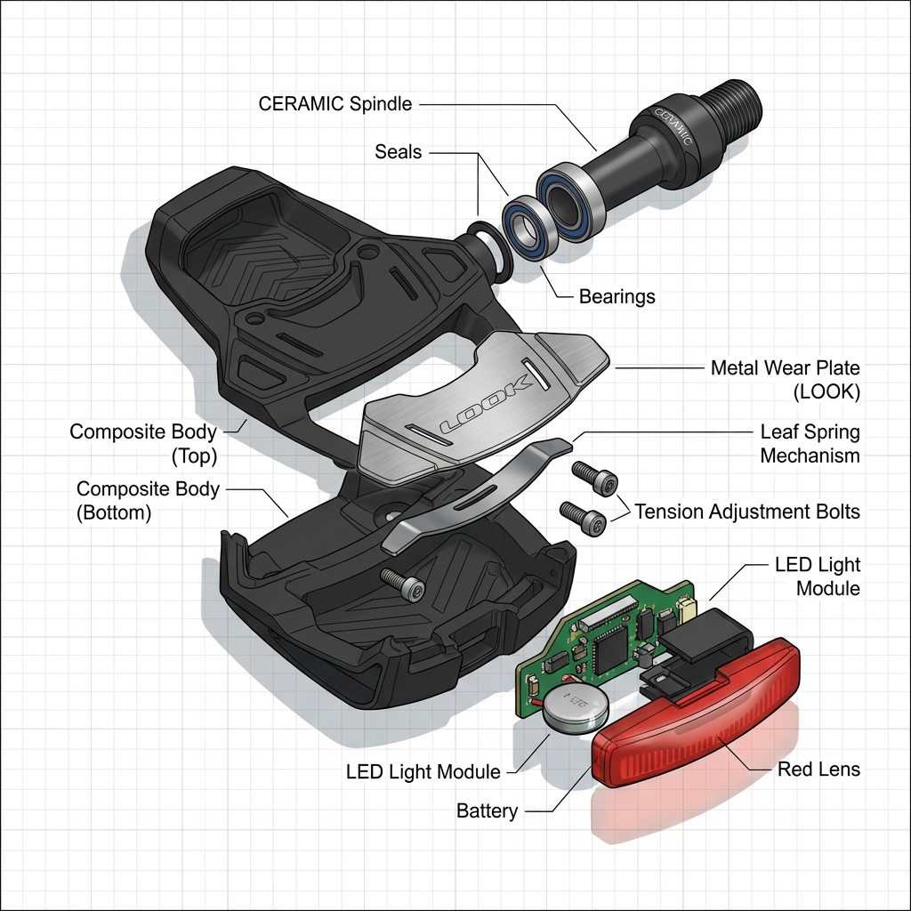 Dans la lignée des pédales intelligentes à modules lumineux auto-adaptatifs, LOOK a poussé l’innovation encore plus loin avec sa gamme Keo Blade Ceramic Vision. Ces pédales automatiques haut de gamme intègrent un système d’éclairage arrière révolutionnaire, conçu pour maximiser la visibilité du cycliste tout en conservant les performances et la légèreté emblématiques de la marque. Voici comment LOOK reprend et dépasse les principes d’automatisation et de sécurité vus précédemment :