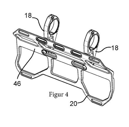 - Compatible avec tous les guidons (droits, cintrés, larges) grâce aux bras réglables (18) et aux ouvertures ajustables (22).