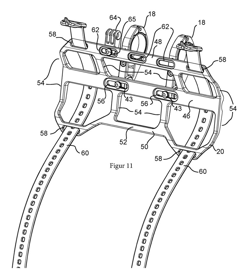 - Fentes supplémentaires (62) sur le rail supérieur (48) pour fixer des accessoires (GPS, lampe, téléphone) via des supports dédiés (64).