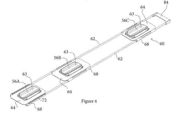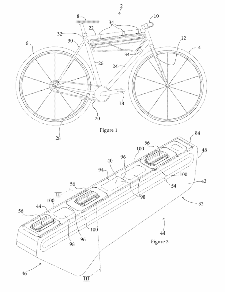 - Deux tiges en carbone (62) s’étendent sur toute la longueur du sac, le long de la paroi d’attache (40) (celle en contact avec le cadre).