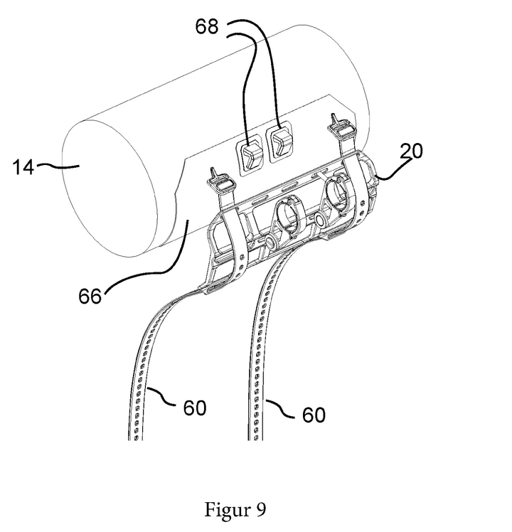 - Mécanisme de tension : Une fois serrées, les sangles compriment le sac contre le support, tandis que les butées (20) empêchent tout mouvement vertical ou latéral.