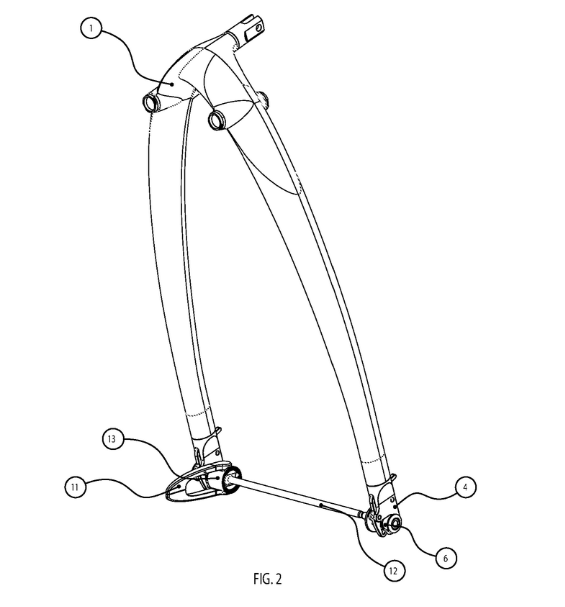- Deux bras bifurqués se fixent sur l’axe de la roue arrière via un skewer (axe rapide) redessiné avec des protrusions latérales (6, 13).