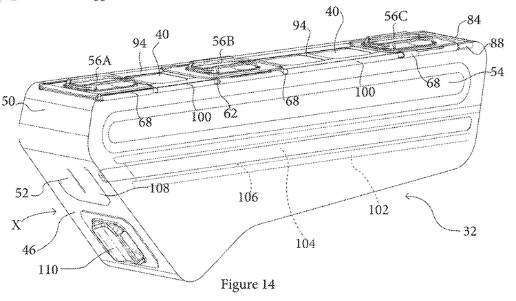 - Blocs milieu/arrière (56B, 56C) : Canaux ouverts aux extrémités (76, 74) pour un glissement des tiges.